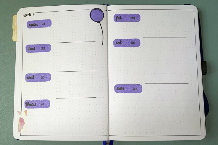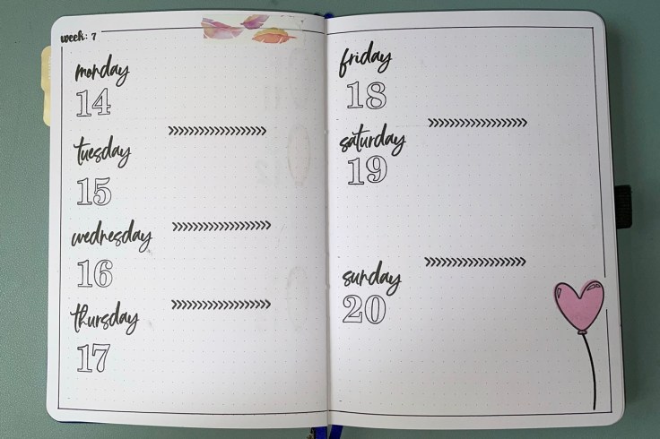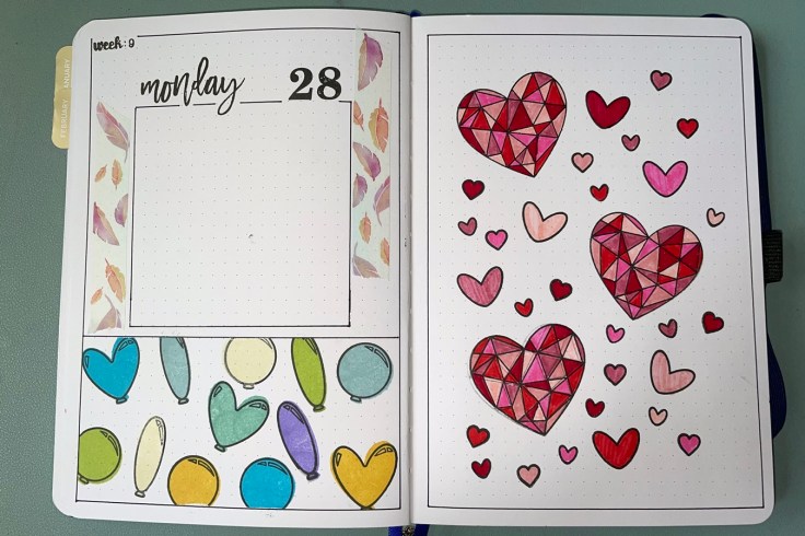 The first week of February was only 6 days so I had more room for stamps. Like January, the last day of February fell on a Monday which meant a one page layout on the left for that day and a filler layout on the right. Given that Valentine’s Day falls in February, I went with a heart themed filler layout. I used various heart shaped stamps and filled them in with my Tombows.