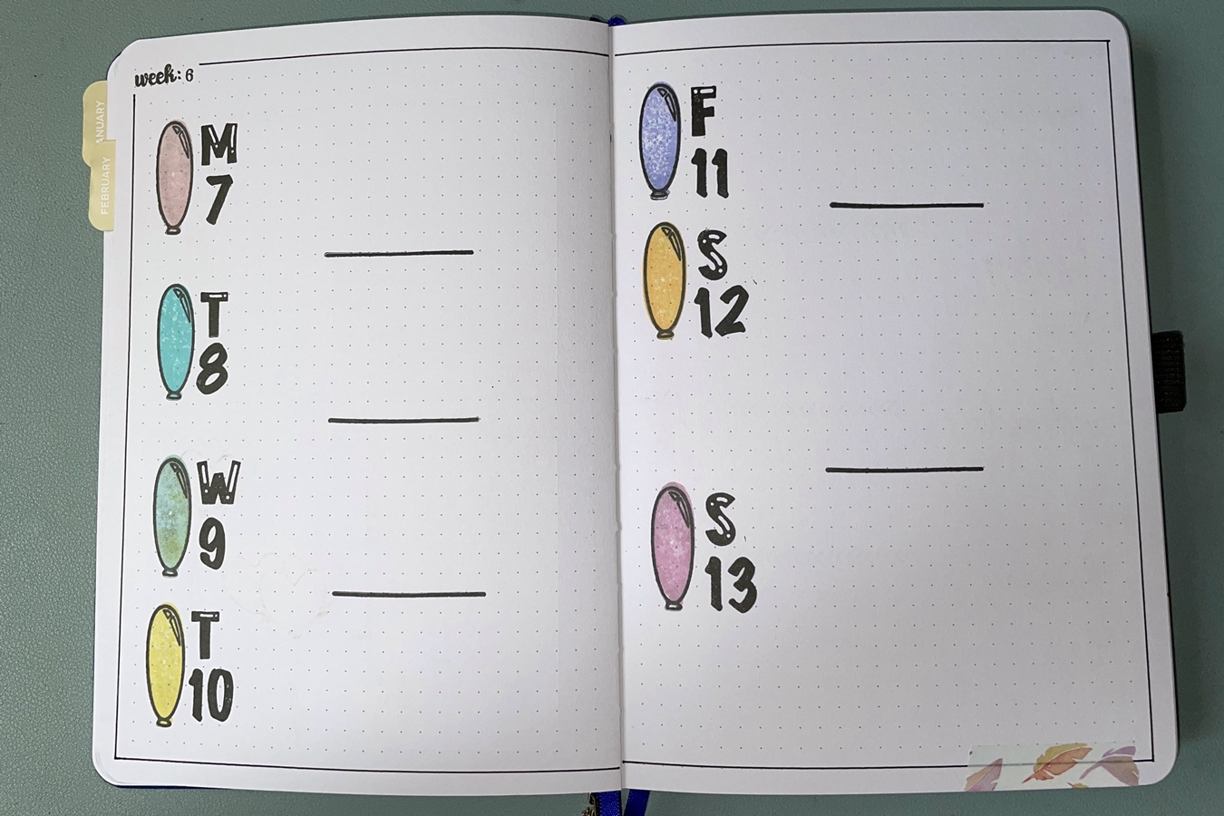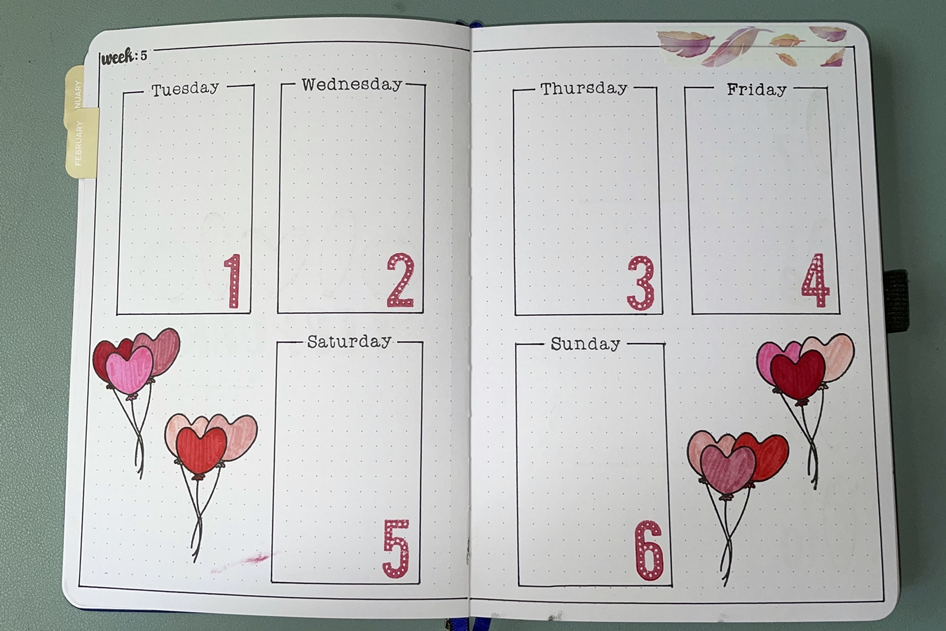 The first week of February was only 6 days so I had more room for stamps. Like January, the last day of February fell on a Monday which meant a one page layout on the left for that day and a filler layout on the right. Given that Valentine’s Day falls in February, I went with a heart themed filler layout. I used various heart shaped stamps and filled them in with my Tombows.