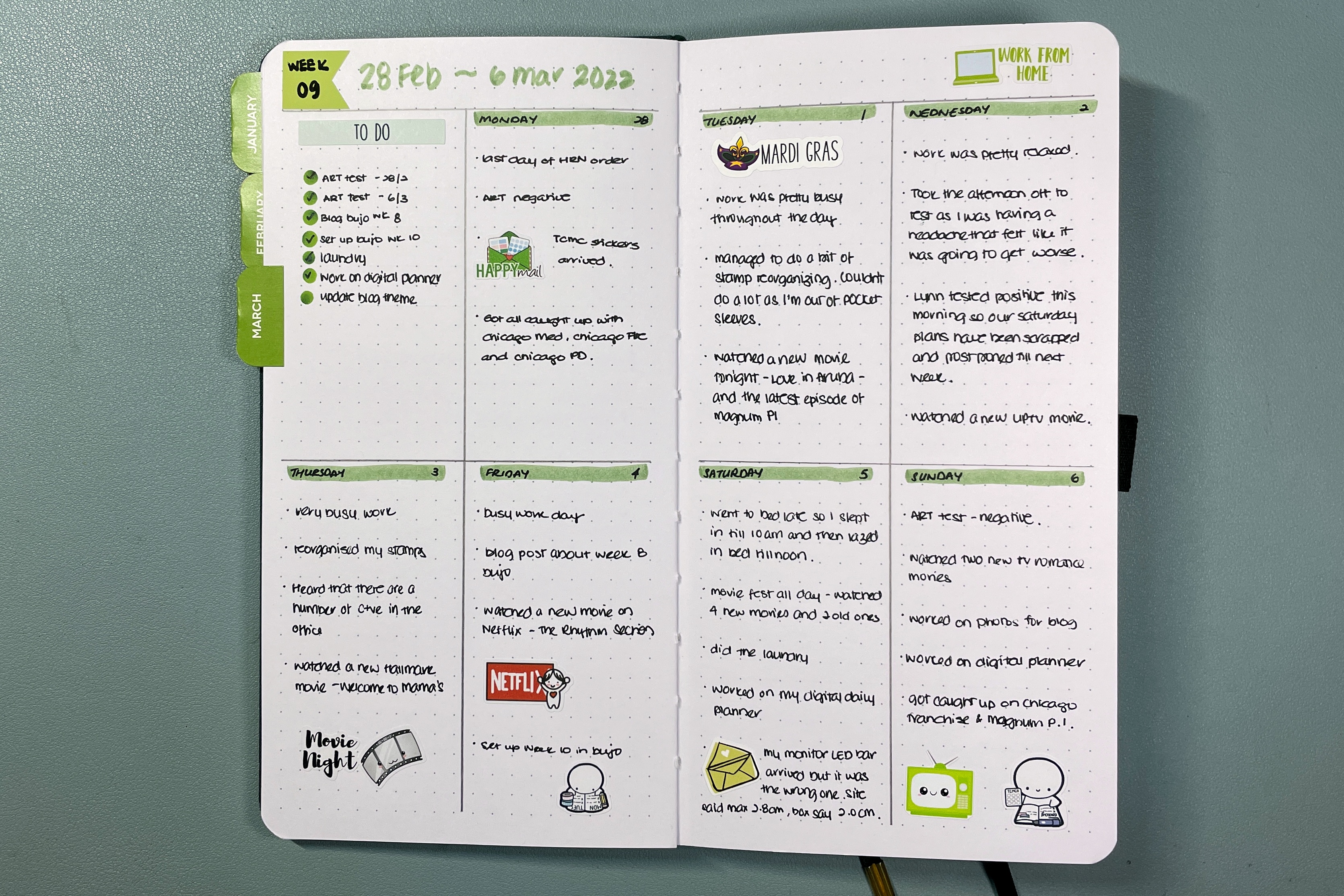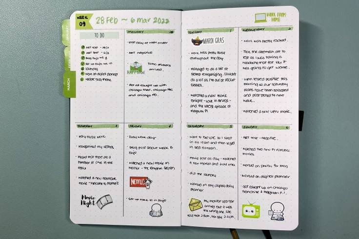 As you can see I really went all green. I went back to a layout I’ve used before with one change. This is rather than having the first section for “this week”, I used it for my “to do” list for the week. I’ve been enjoying using the Dot Markers to create my to do dots.