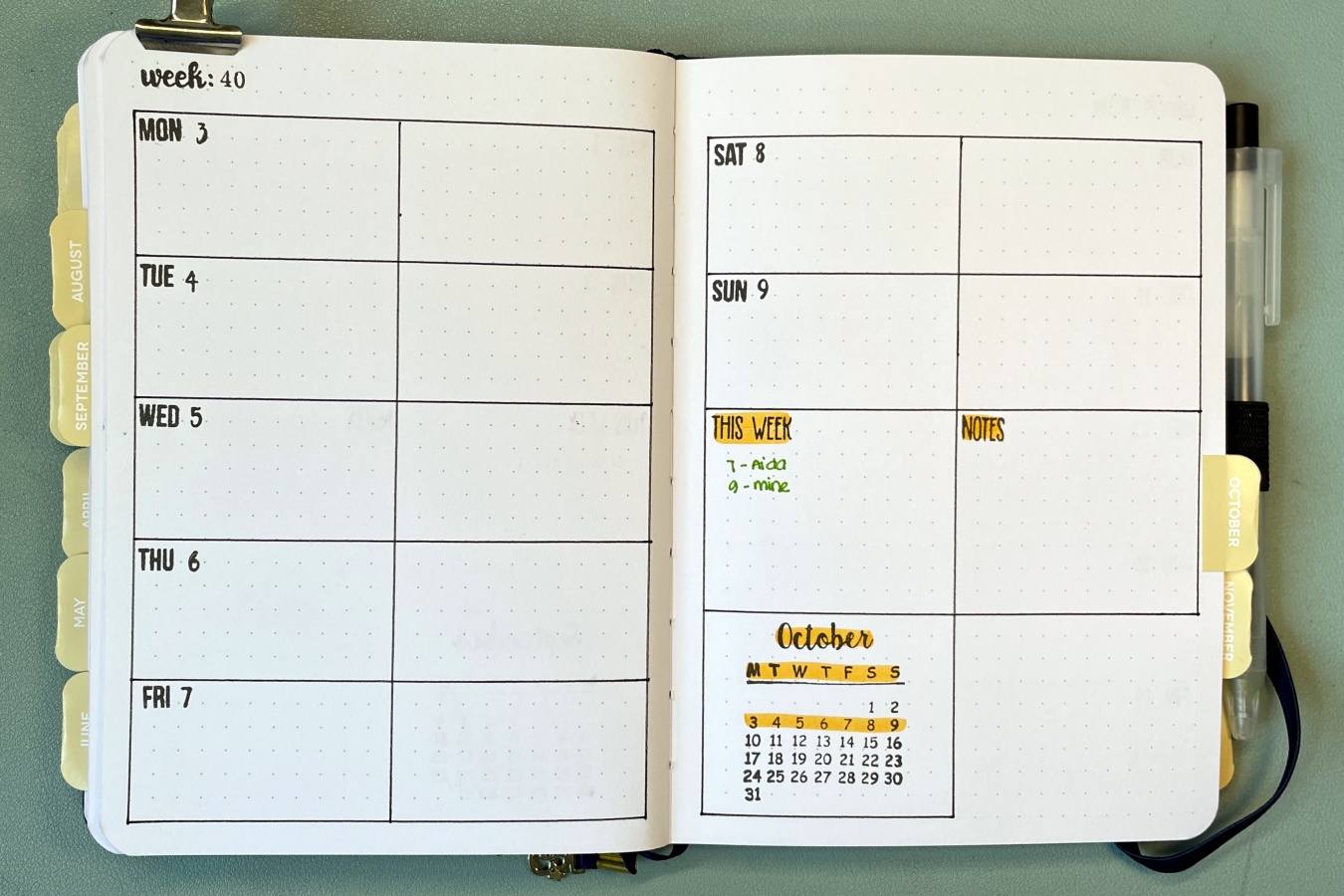 I still use different colour ink as an additional way to keep things organized. Sorry I can’t show a filled page due to work confidentiality.