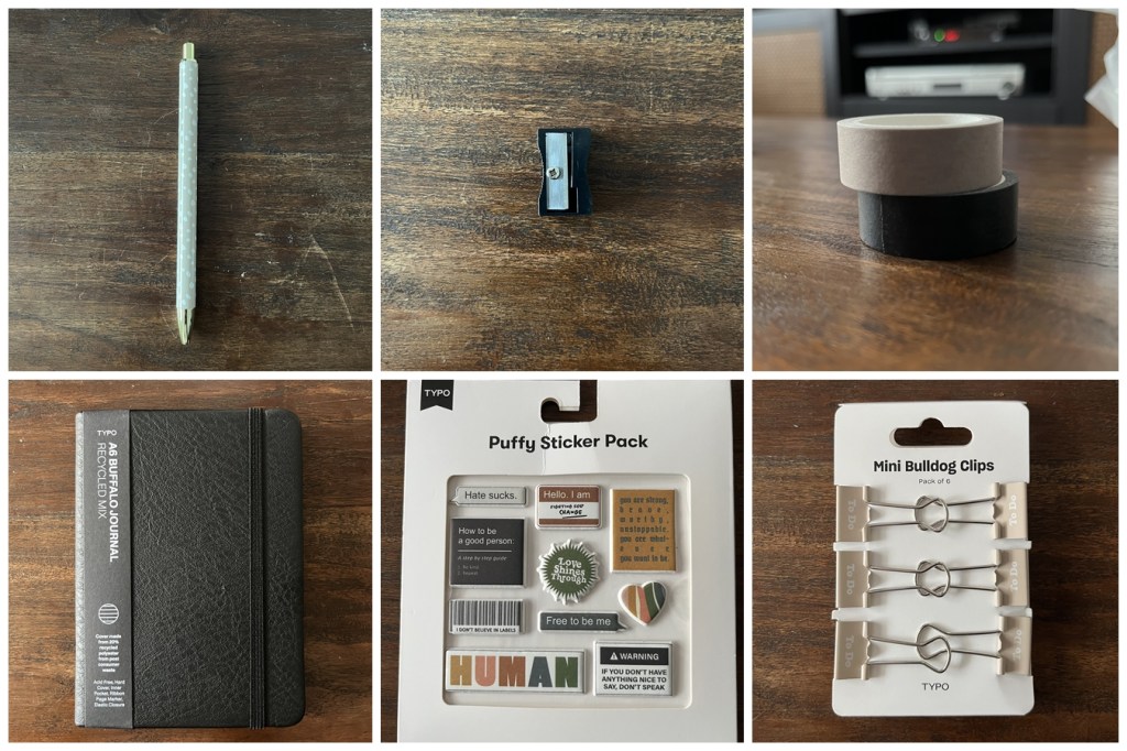 Items 1 – 6: (1) ballpoint pen; (2) pencil sharpener; (3) 2 rolls of washi tape; (4) A6 lined notebook; (5) puffy stickers; (6) mini bulldog clips