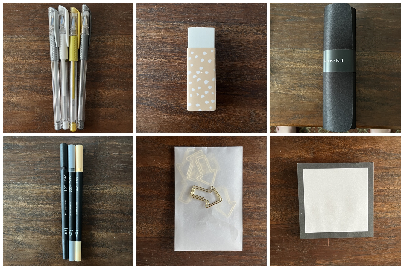Items 7 – 12: (7) 4 gel pens; (8) eraser; (9) mouse pad; (10) 3 dual tip markers; (11) gold arrow paperclips; (12) post it notes