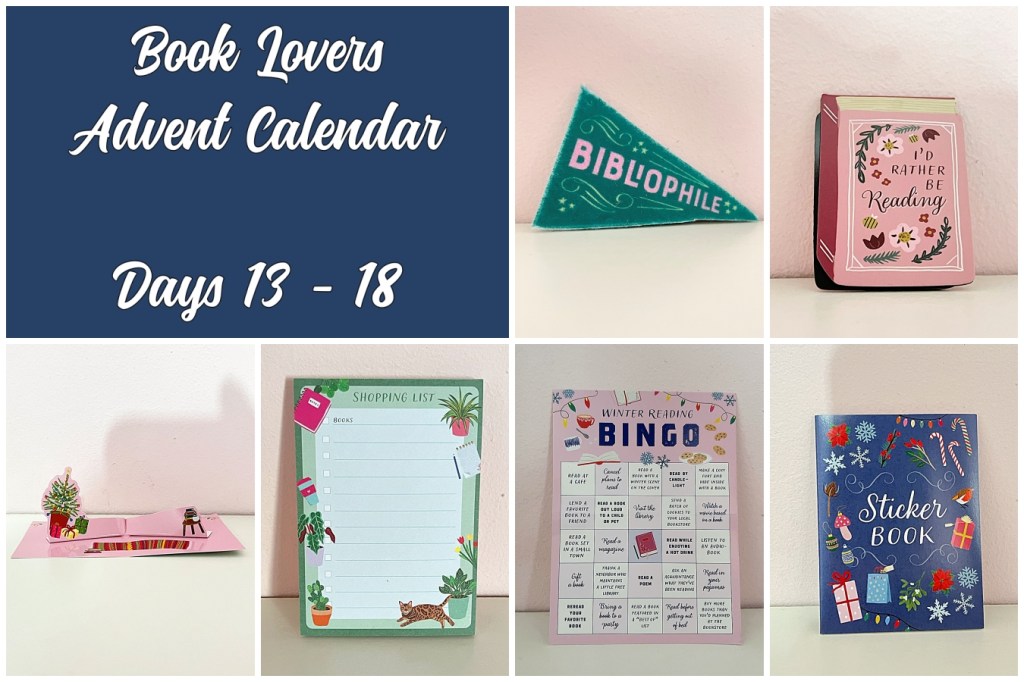 (13) pennant; (14) magentic bookmark; (15) mini pop up card; (16) shopping list post it notes; (17) bingo card; and (18) mini sticker book.