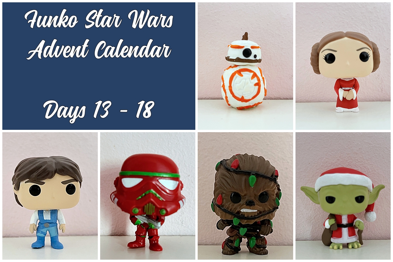 (13) BB-8 snowman; (14) Princess Leia in red dress; (15) Han Solo in baby blue outfit; (16) Stormtrooper Christmas colours; (17) Chewbacca Christmas deco; and (18) Yoda Santa.