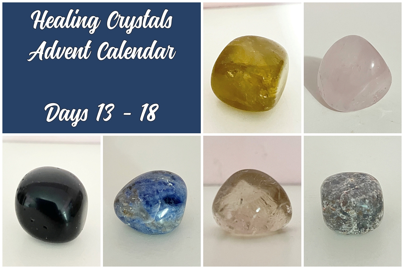 (13) smoky quartz; (14) rose quartz; (15) black obsidian, (16) sodalite; (17) clear quartz; and (18) lepidolite (I think – couldn’t find anything to match but an image search on google came up with this).
