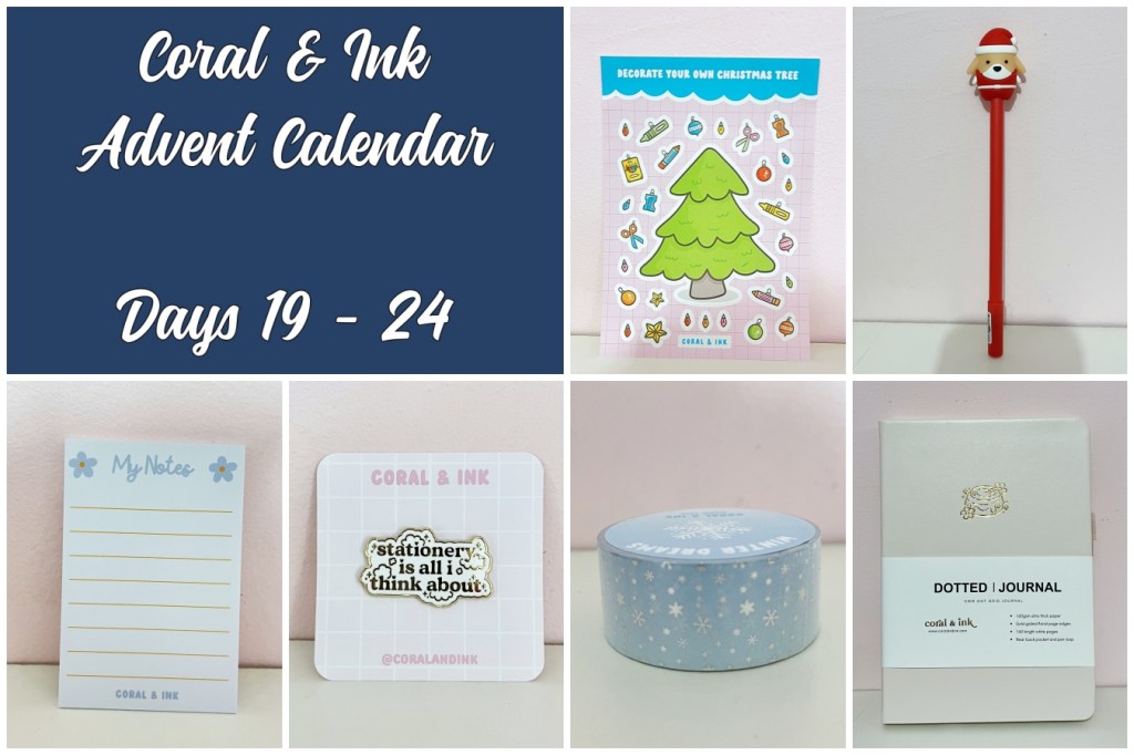 (19) large sticker sheet of a Christmas tree and it’s trimmings; (20) Santa pup pen; (21) mini “my notes” pad; (22) pin; (23) washi tape; (24) dotted journal