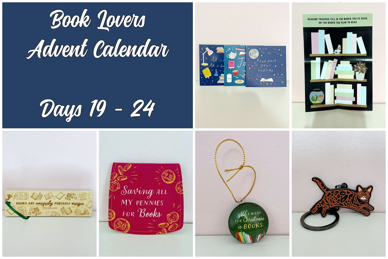 (19) greeting cards; (20) reading tracker sticker; (21) wooden bookmark; (22) felt coin purse (23) Christmas ornament; (24) cat keychain.