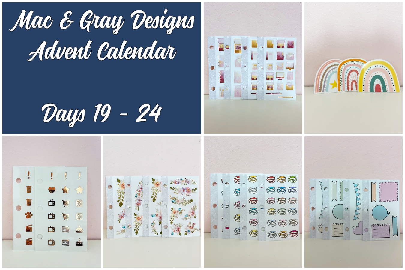 More stickers – (19) work relate; (20) rainbows; (21) gold foil icons; (22) floral; (23) books and (24) shapes.