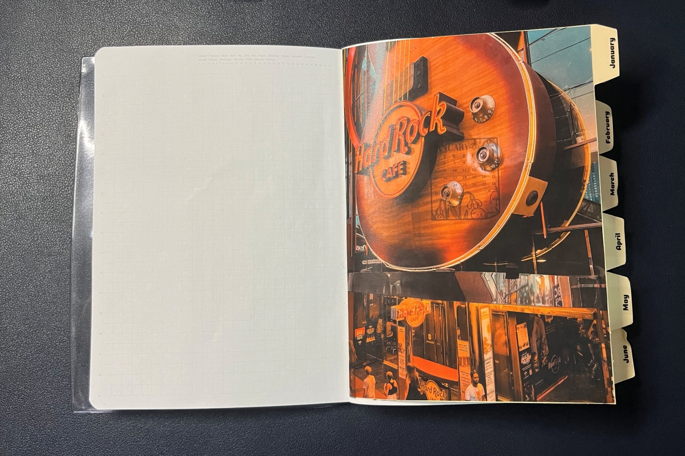 I tipped in some monthly dividers using card dividers from my office with pictures printed on tracing paper in front. I tipped the dividers in to give me another pages for every day of the year as well as to section off each month. I use a different photo for each month and all the photos were taken by me. On the card dividers themselves, I’ve used mini monthly calendar stickers – you just make it out behind the picture.