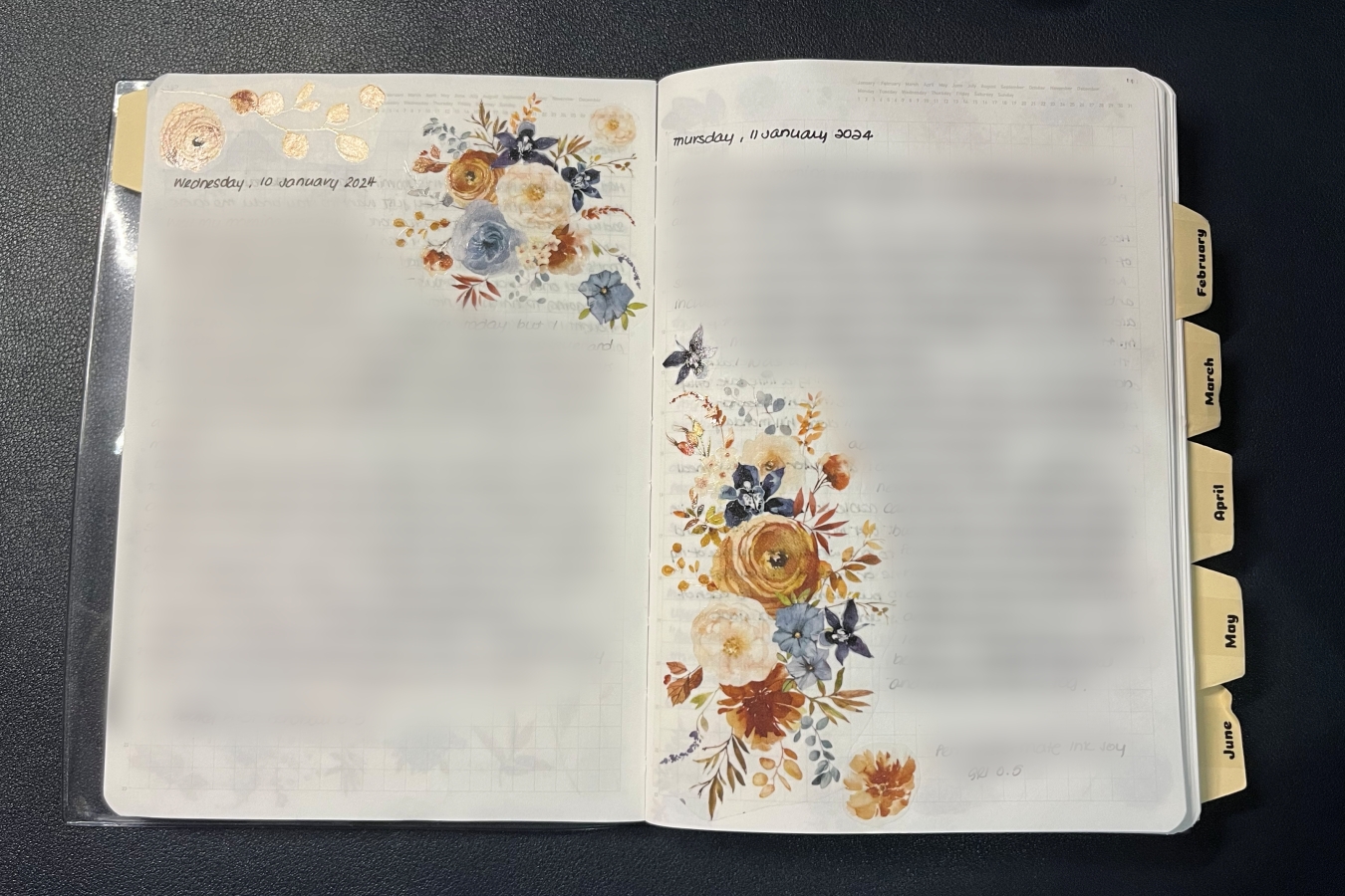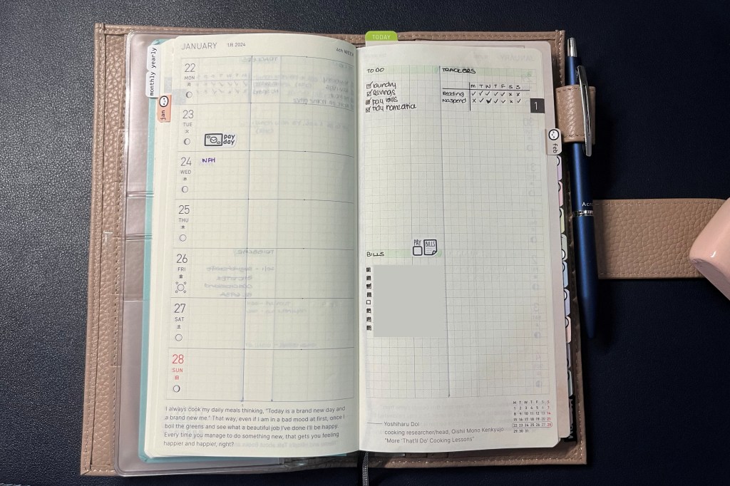 My plan is to use a wide washi tape to decorate the page and the rest is just me writing down my daily thoughts and happenings. I got my washi tape from The Washi Shop and the one I used for January is Dusty Blue and Cinnamon. I’ve blurred out the body of my writing as you don’t need to know how boring my life can be hahaha. As for what I use to write, well I actually mix it up and use a variety of pens from Pentel Energels to Paper Mate Inkjoys to Uniball Signo Micro 207s. The main thing is that the ink is always black.